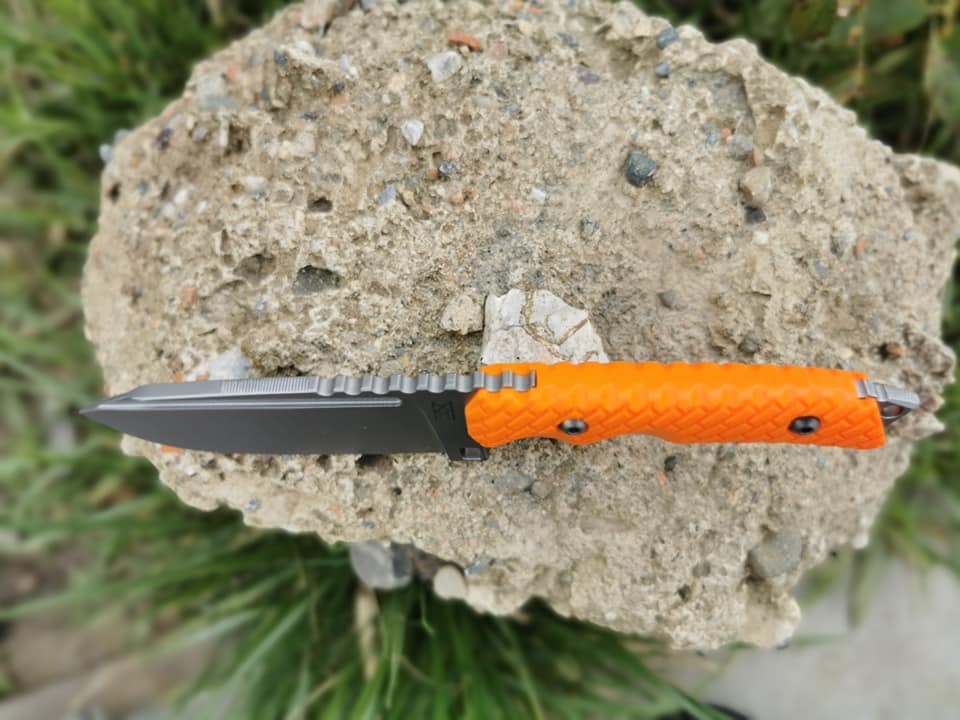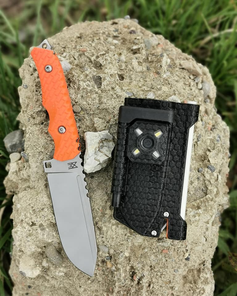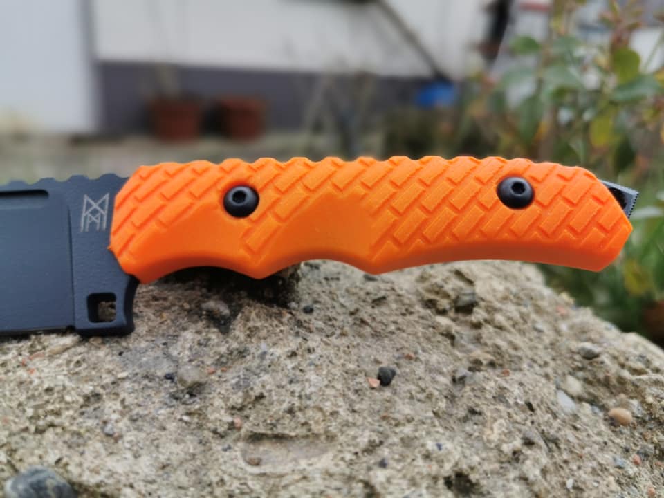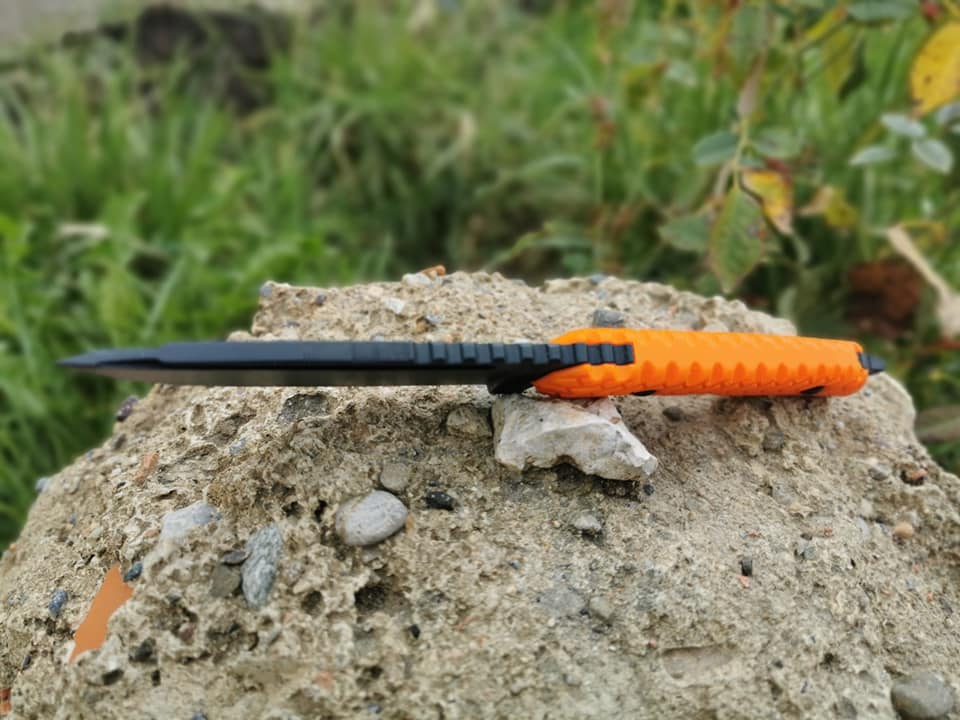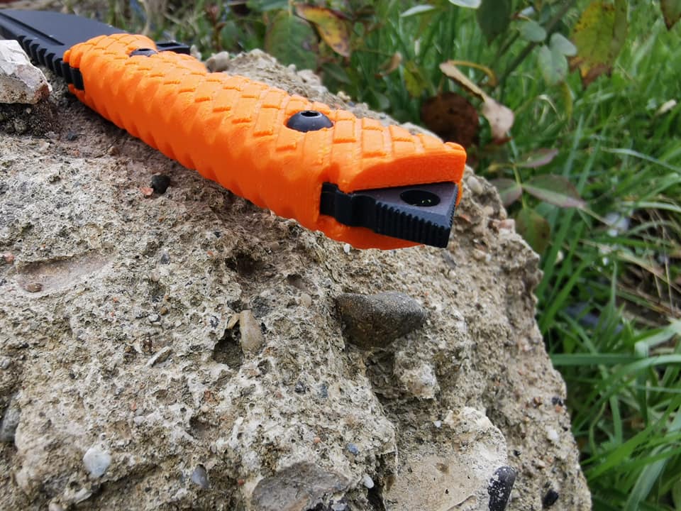 The special feature of the knife is that it has a TPU handle that can be attached from behind. This handle is super resistant. It also has a glass breaker.