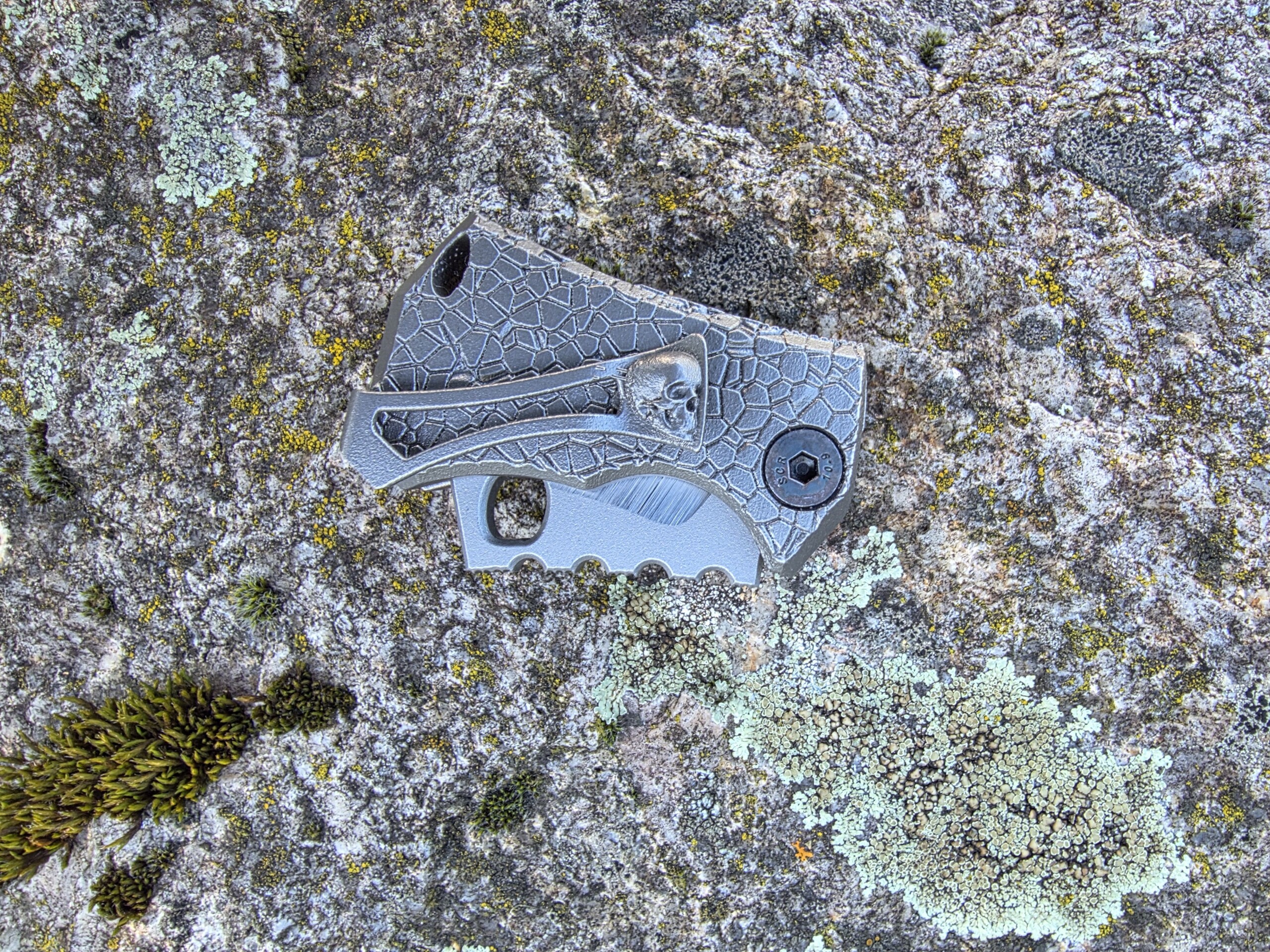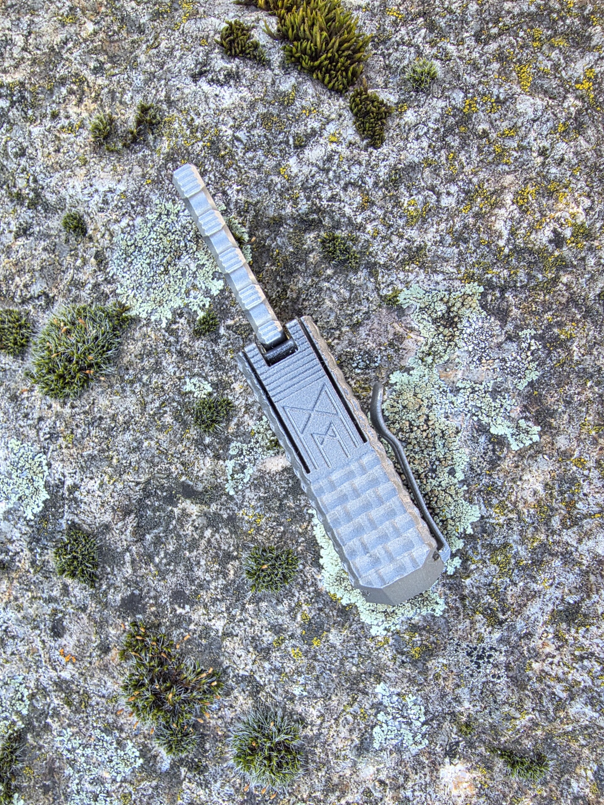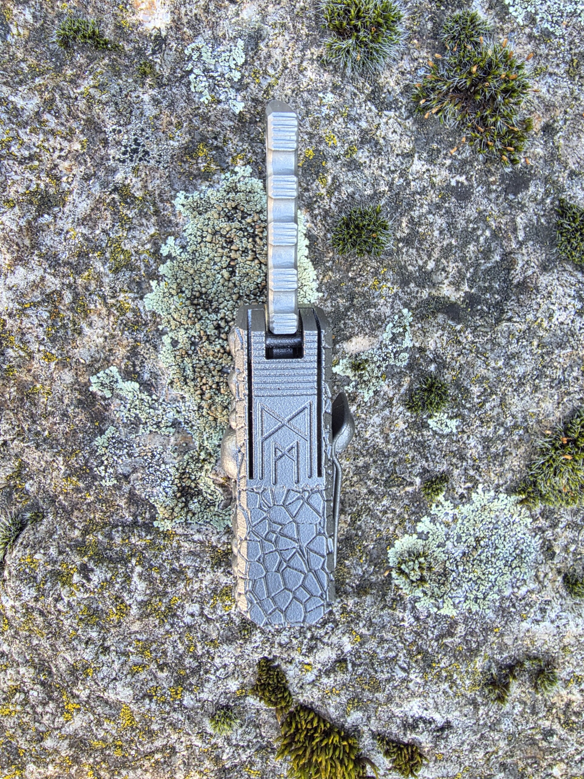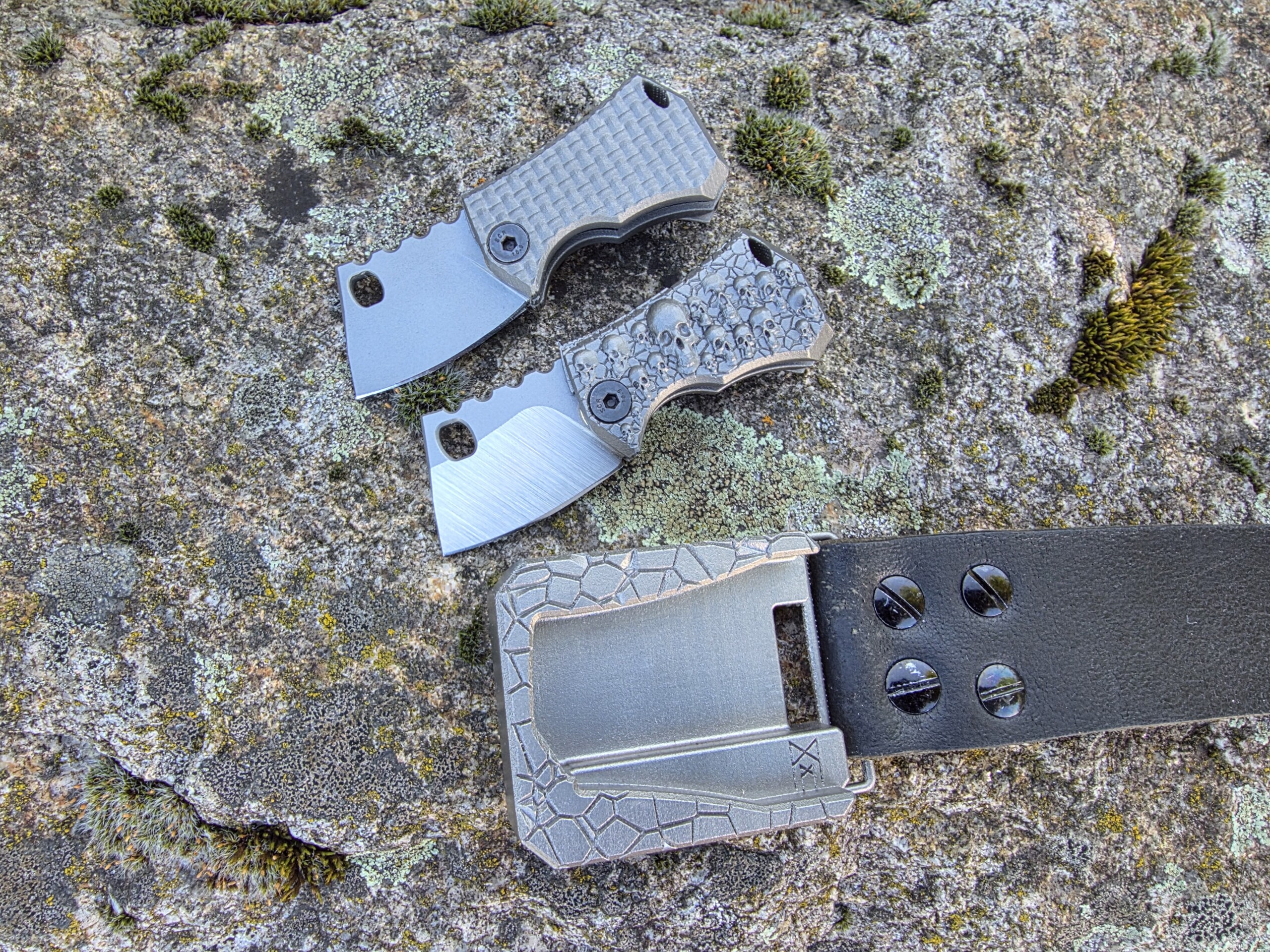 Die Klinge wird von Hand hergestellt — Made in Germany. Der Griff: vollintegral aus titan, gefertigt im 3D-Drucker für höchste Festigkeit bei minimalem Gewicht. Besonderheit: das Messer dockt sauber in eine ebenfalls 3D-gedruckte Titanschnalle — trage es permanent am Gürtel als funktionale Gürtelschnalle.