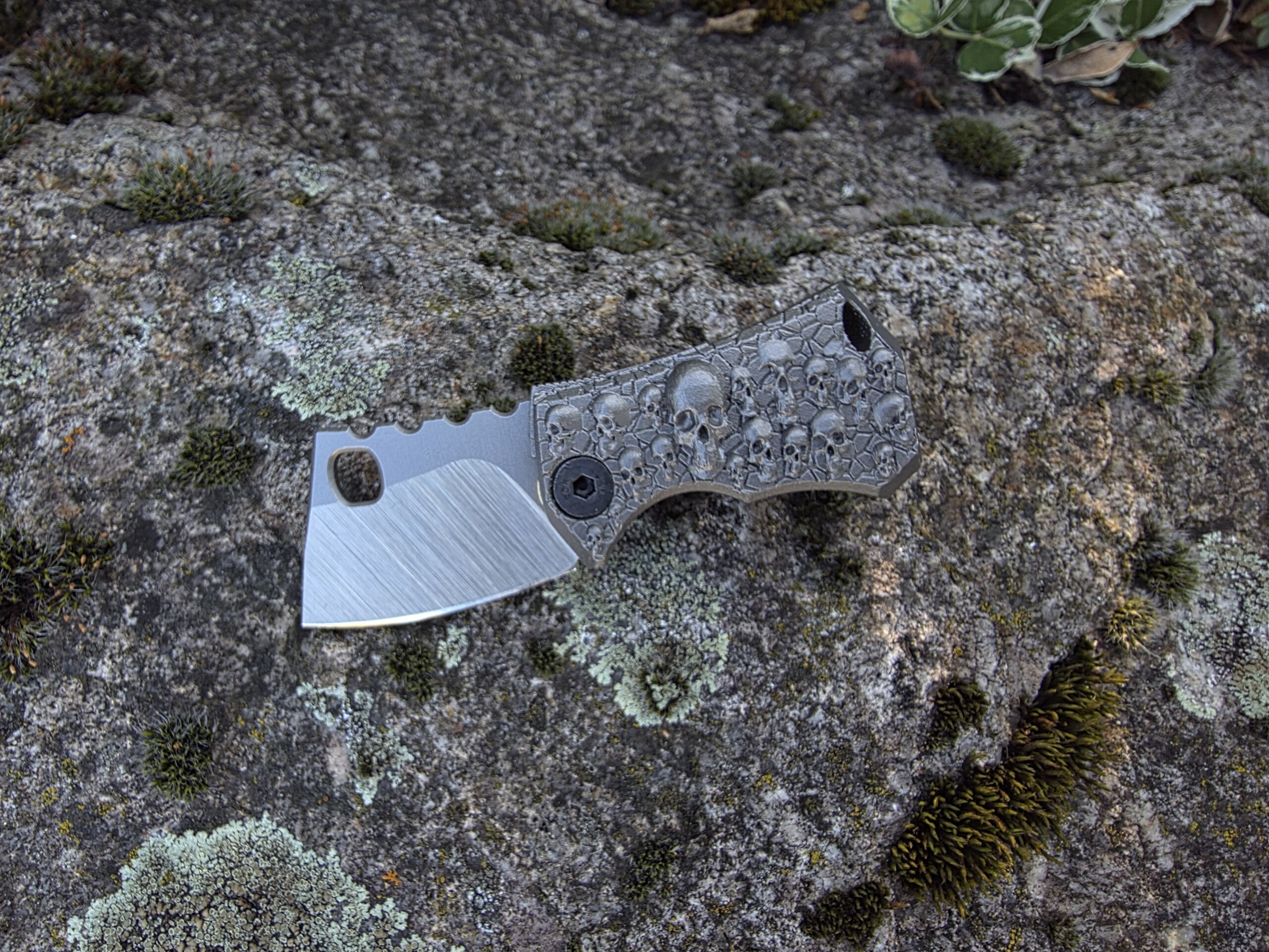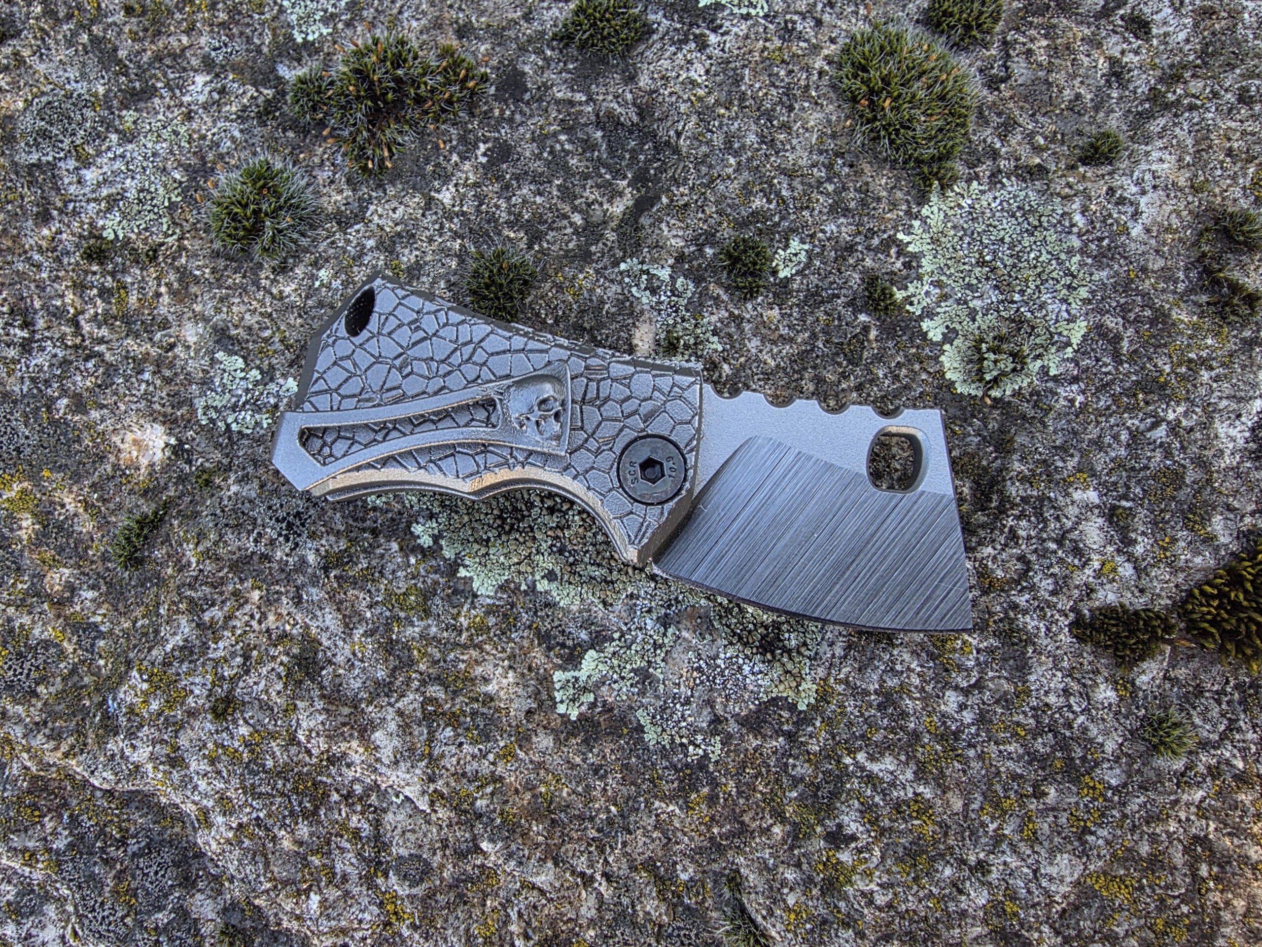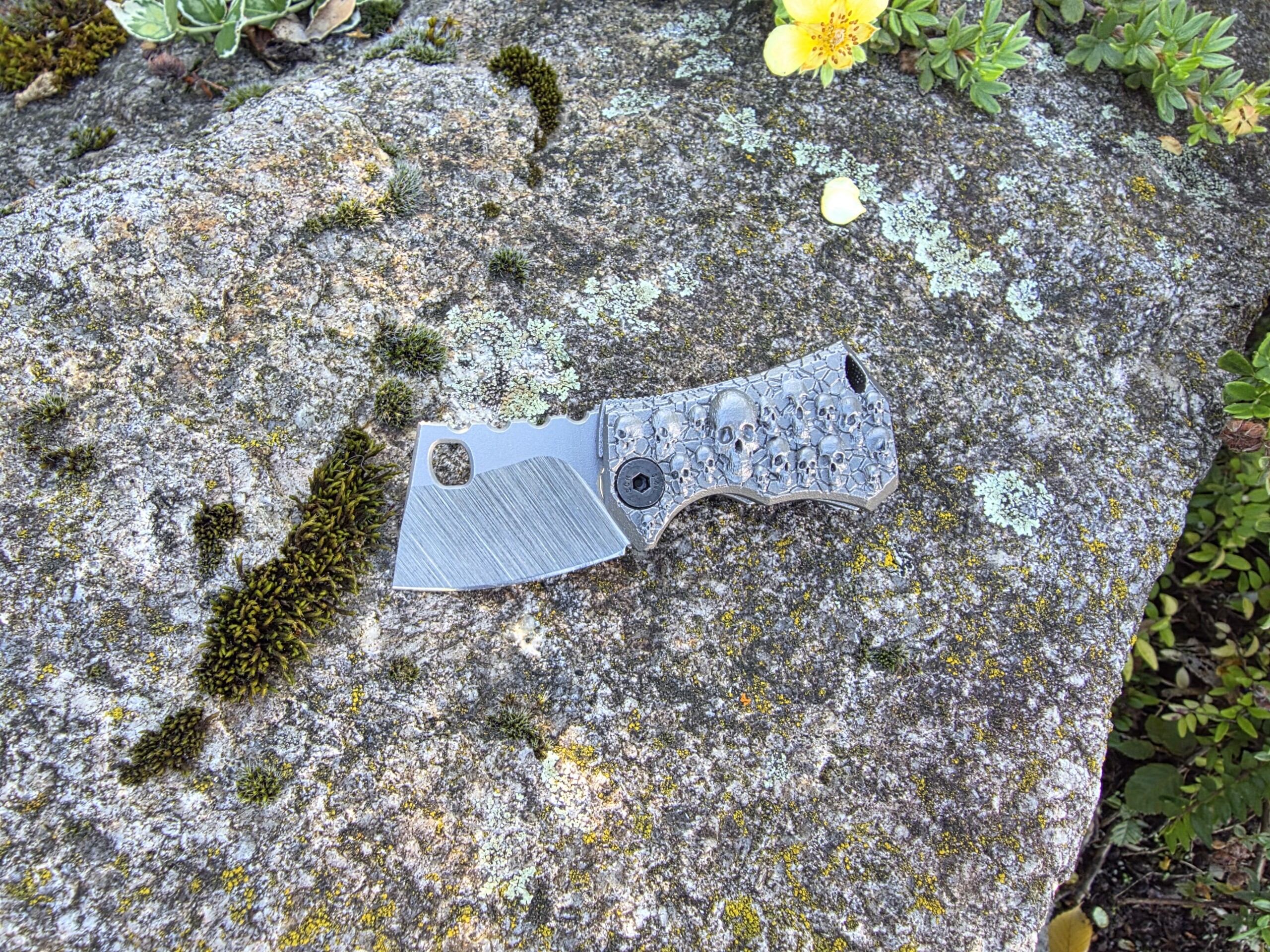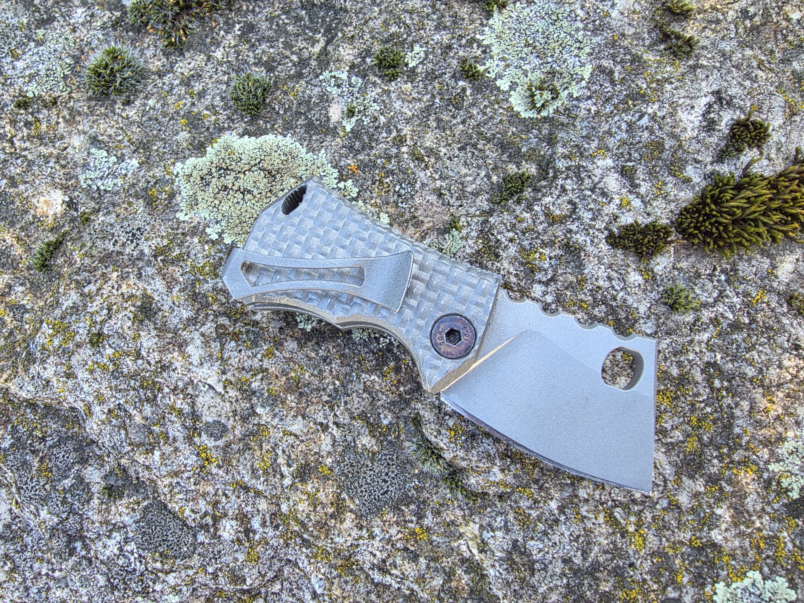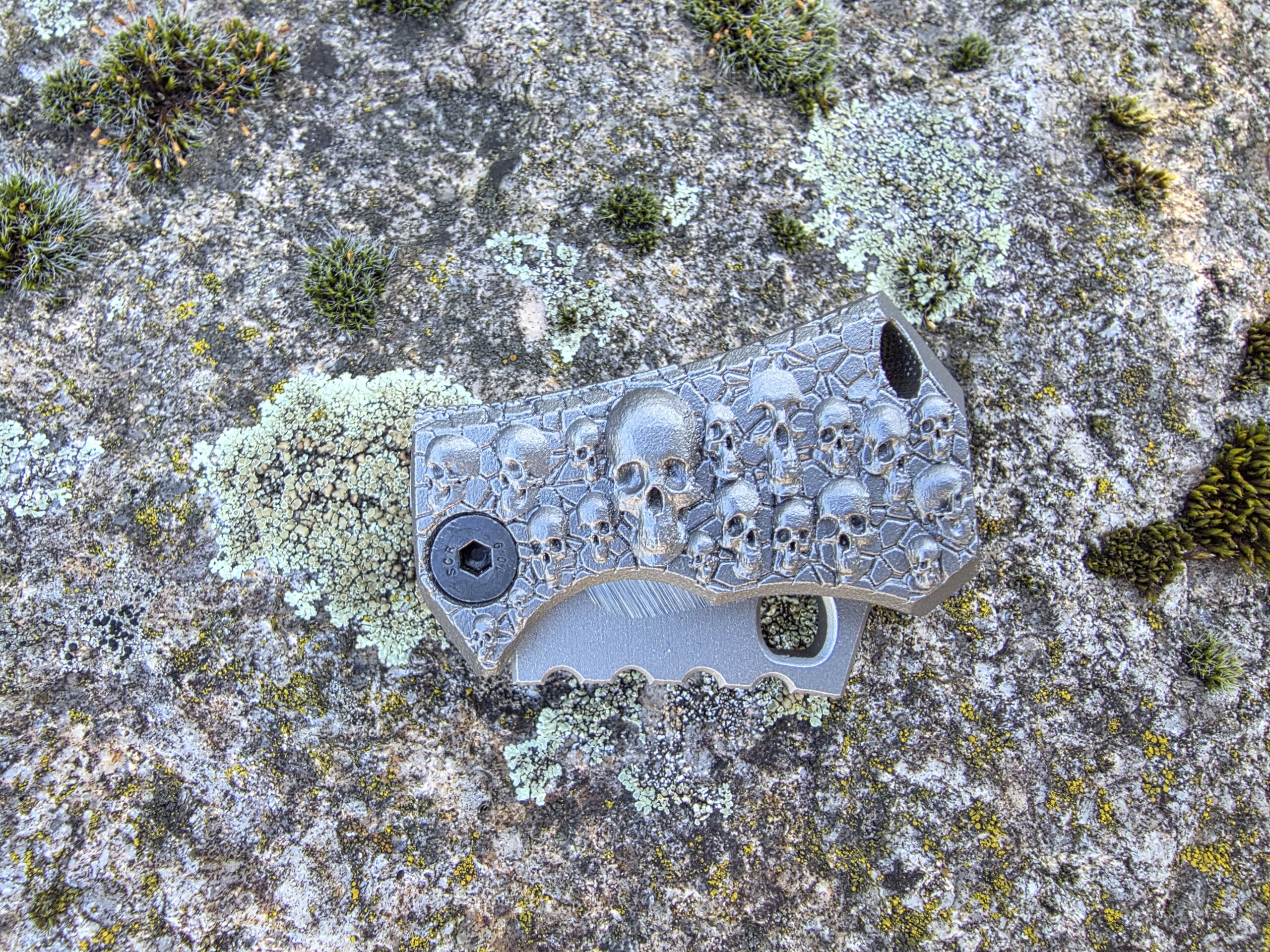 Die Klinge wird von Hand hergestellt — Made in Germany. Der Griff: vollintegral aus titan, gefertigt im 3D-Drucker für höchste Festigkeit bei minimalem Gewicht. Besonderheit: das Messer dockt sauber in eine ebenfalls 3D-gedruckte Titanschnalle — trage es permanent am Gürtel als funktionale Gürtelschnalle.