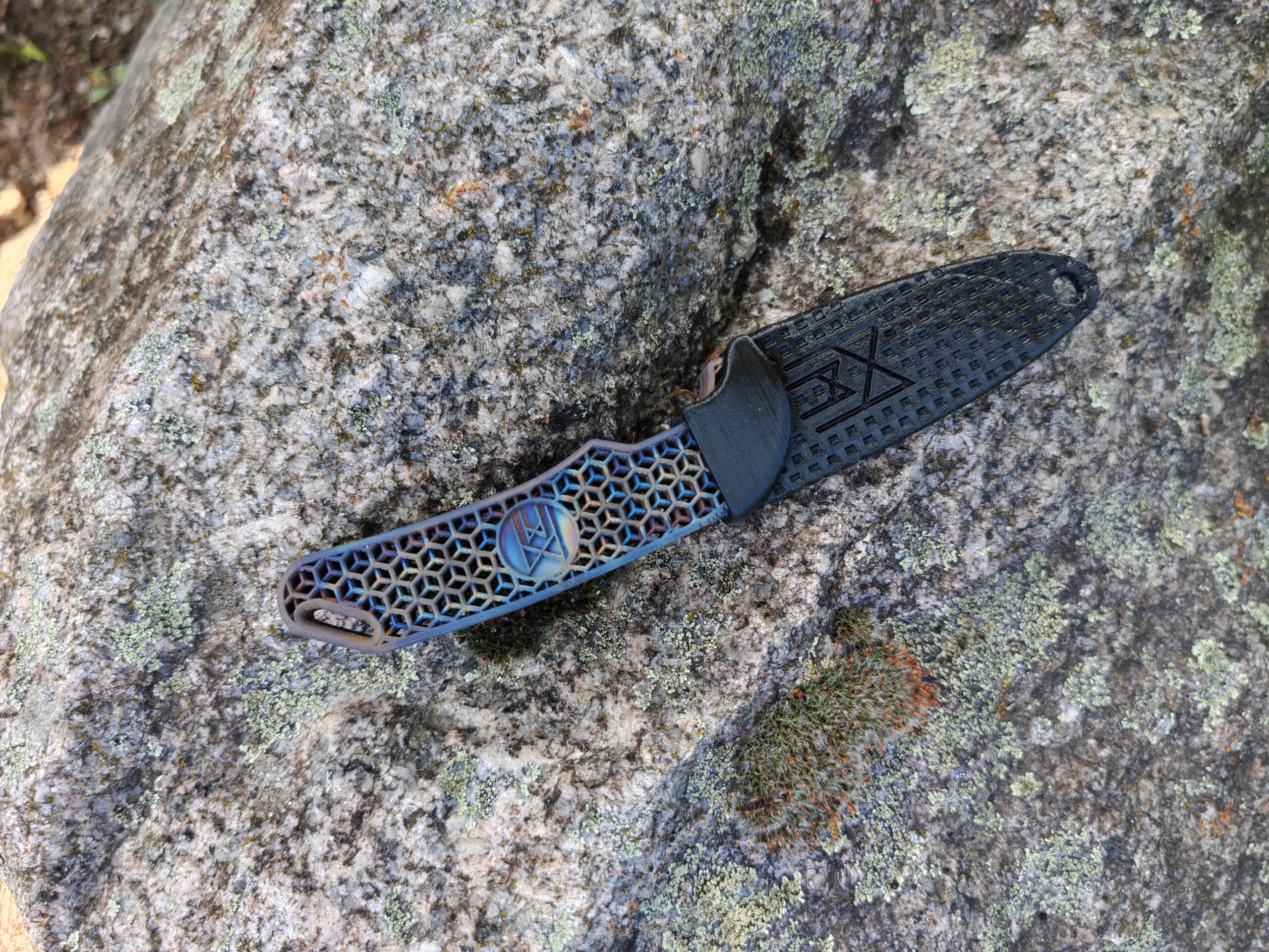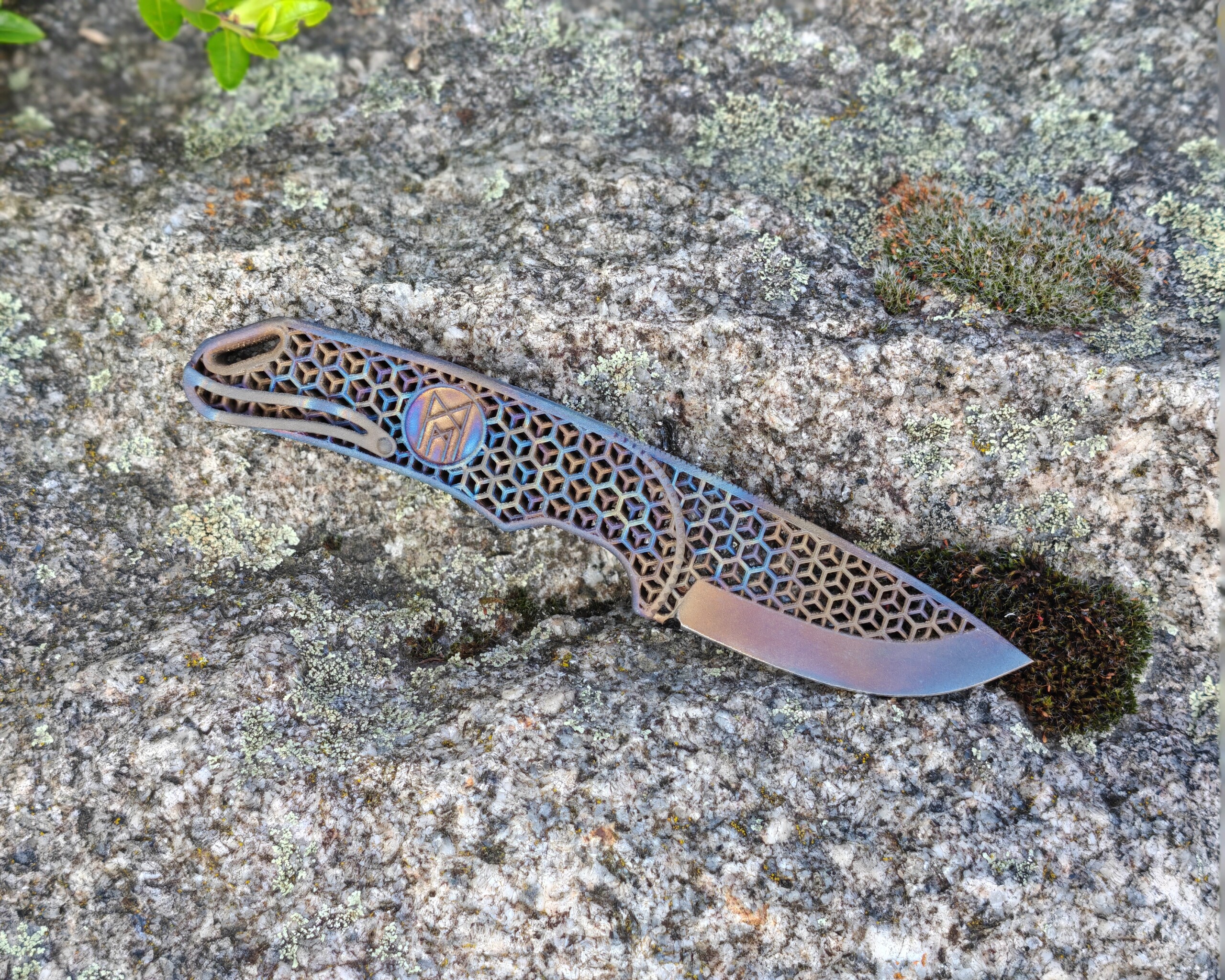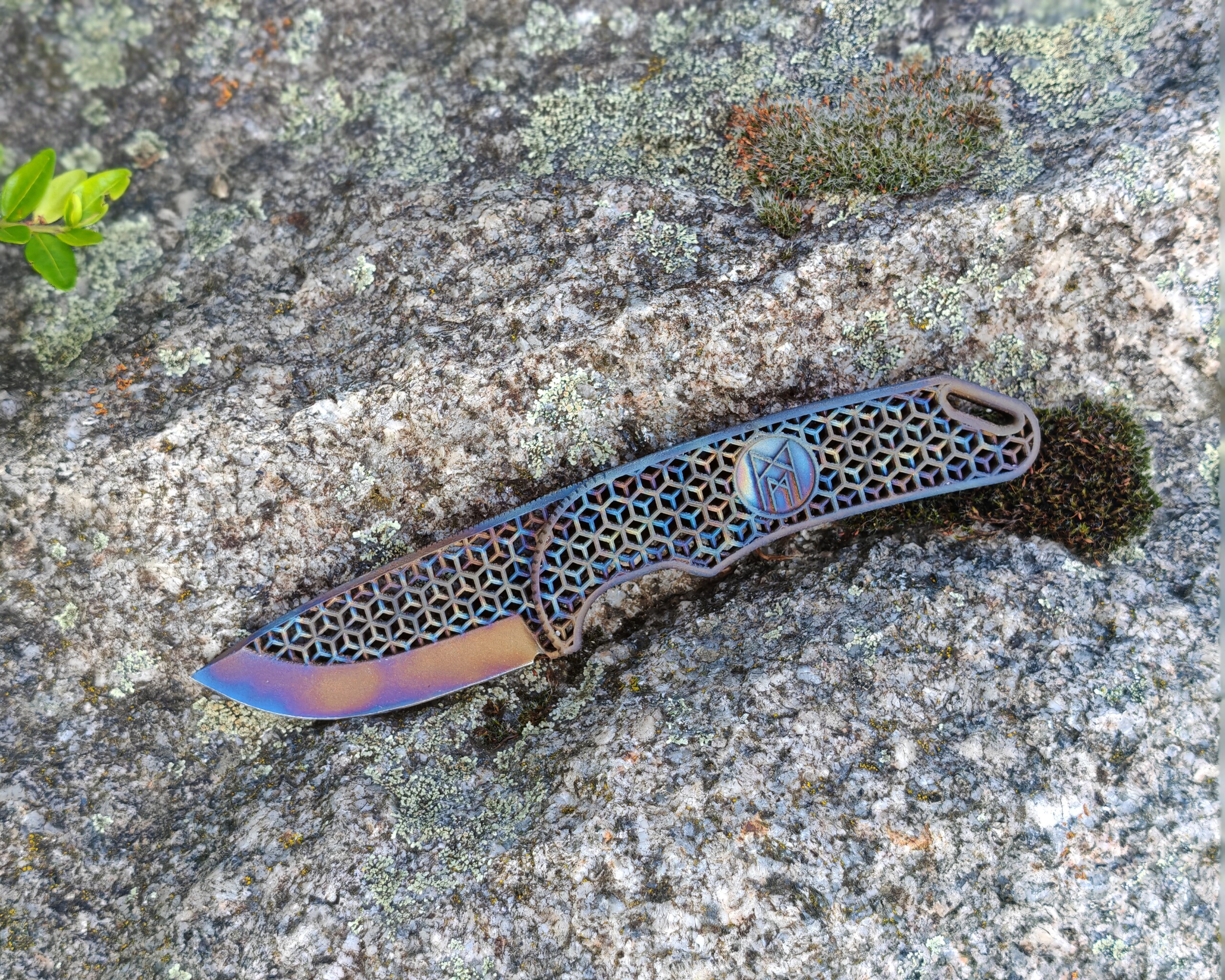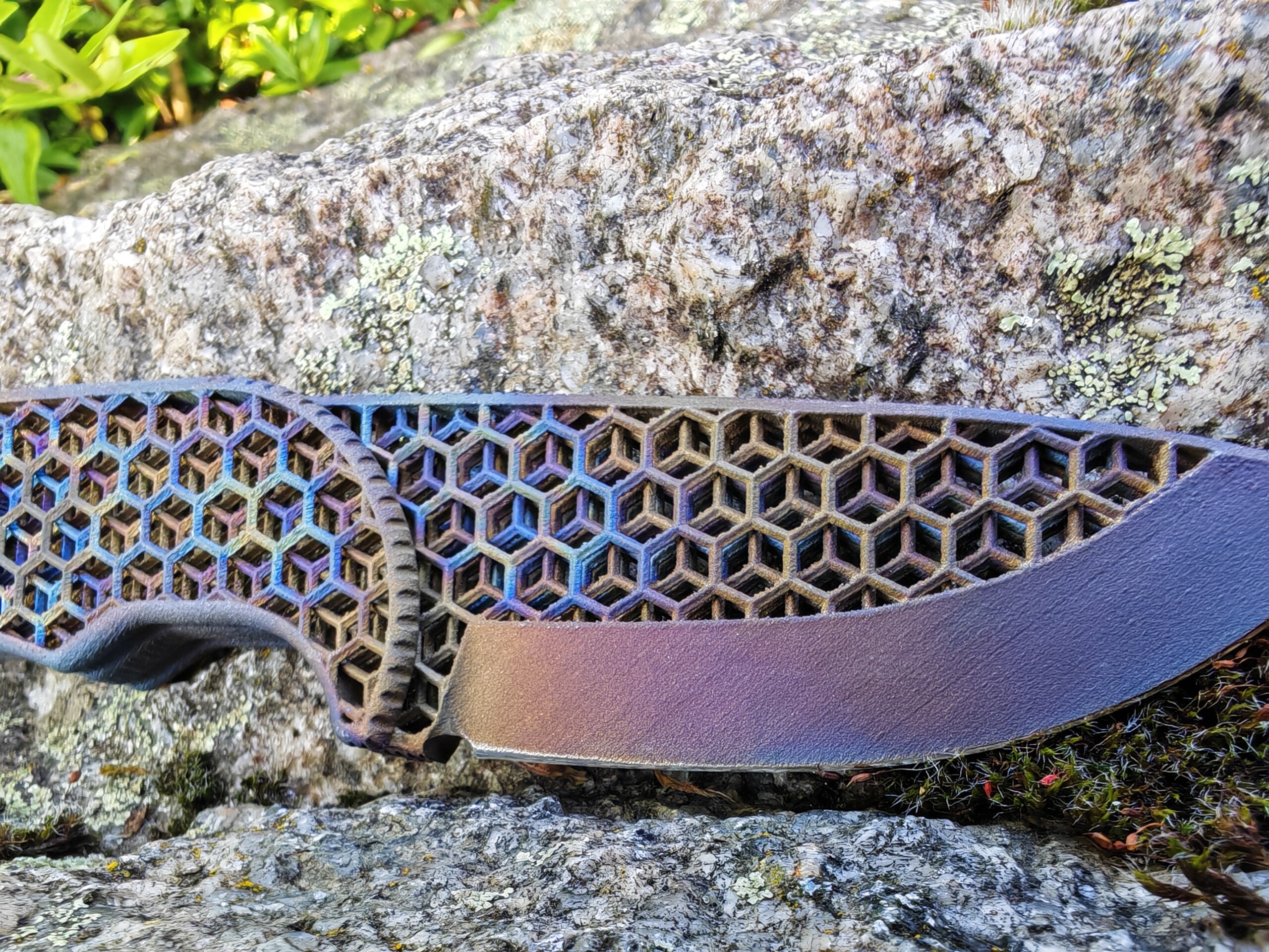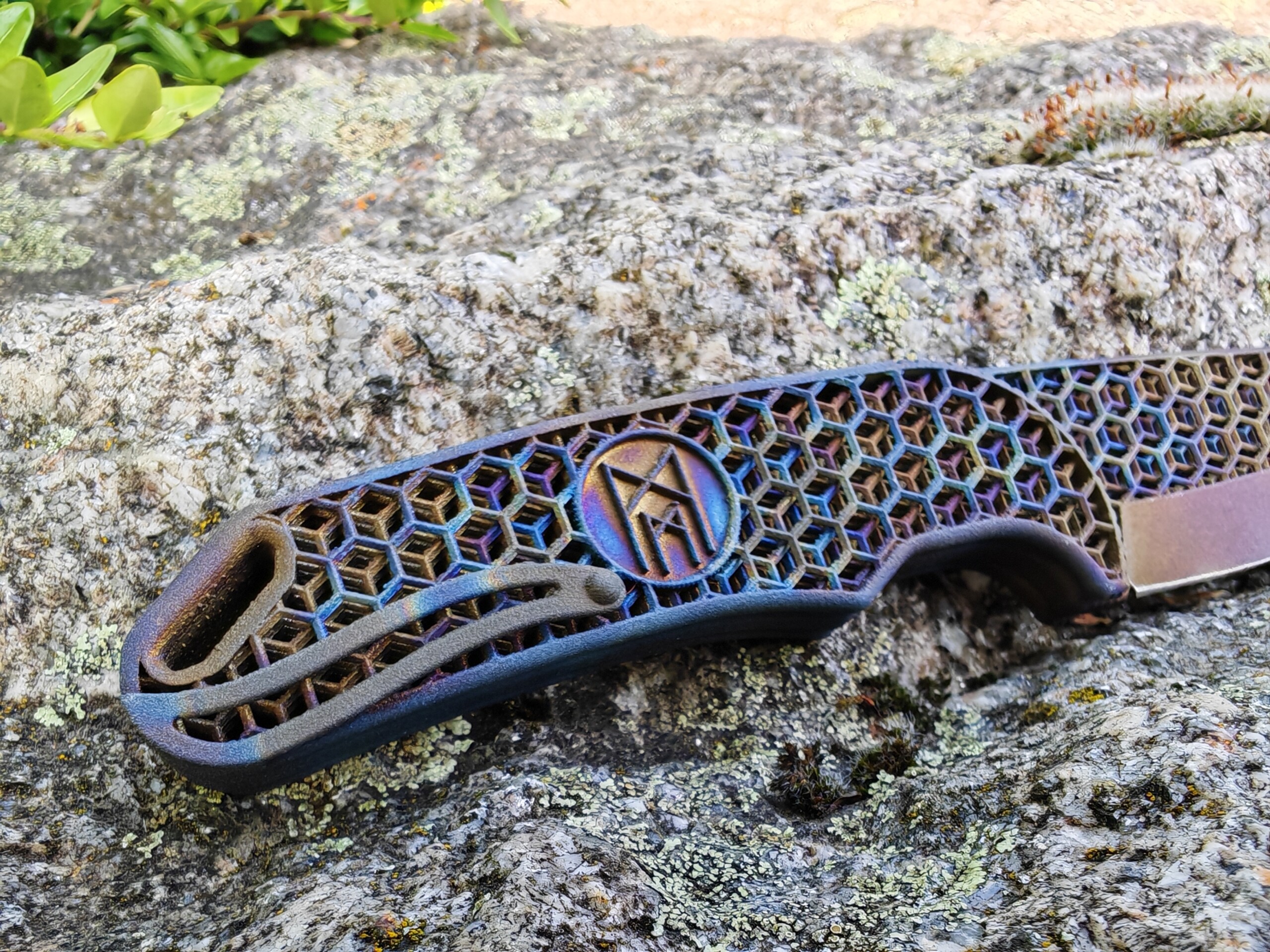 Ein Messer wie kein anderes: Das 3D-gedruckte Volltitanmesser „Hexagon EDC“ vereint modernste Fertigungstechnologie mit kompromissloser Funktionalität – und ist dabei jedes Mal ein einzigartiges Kunstwerk. Jedes Messer sieht anders aus durch die Hitze kolorierung die bei uns von Hand vorgenommen wird.