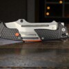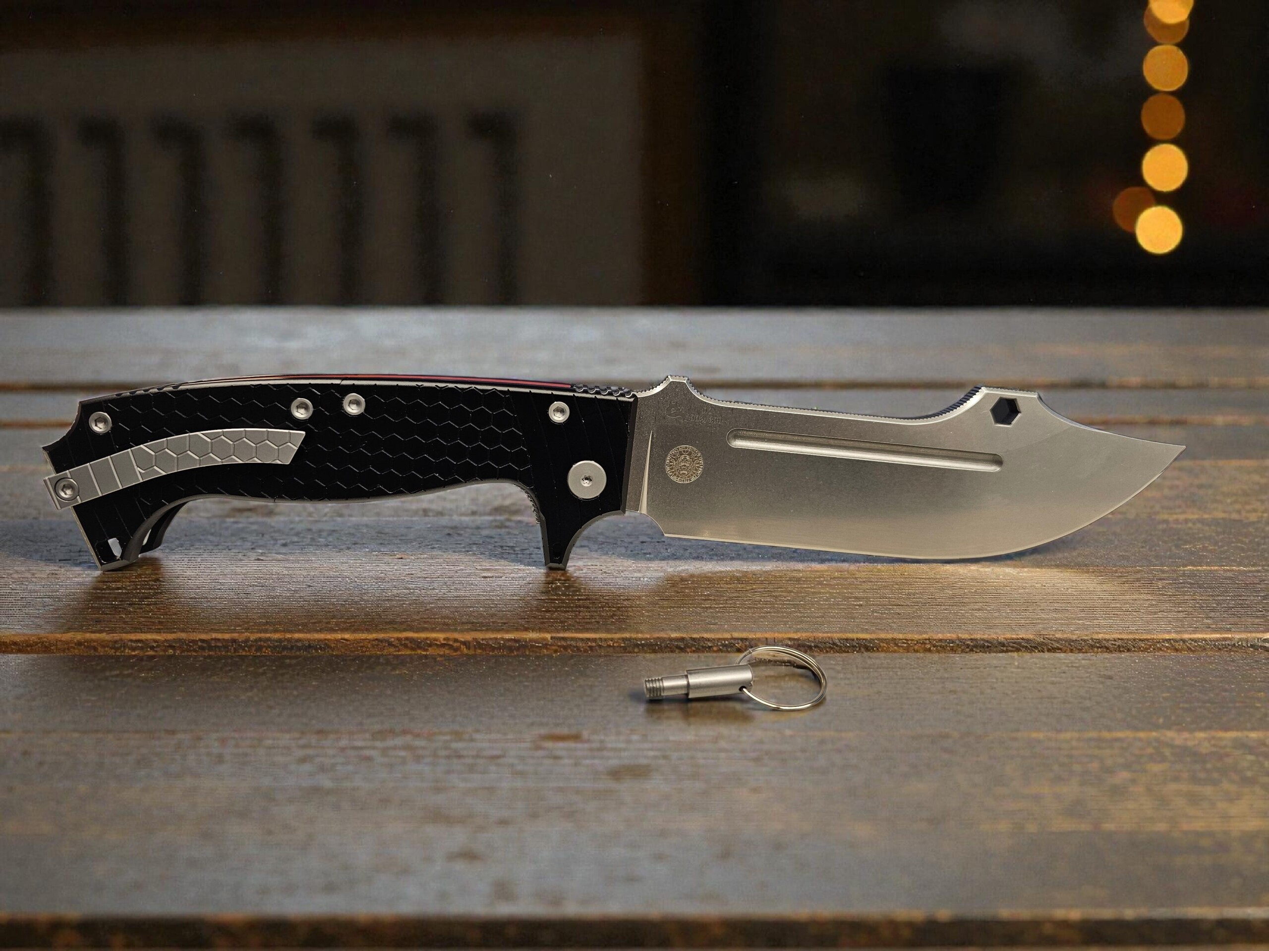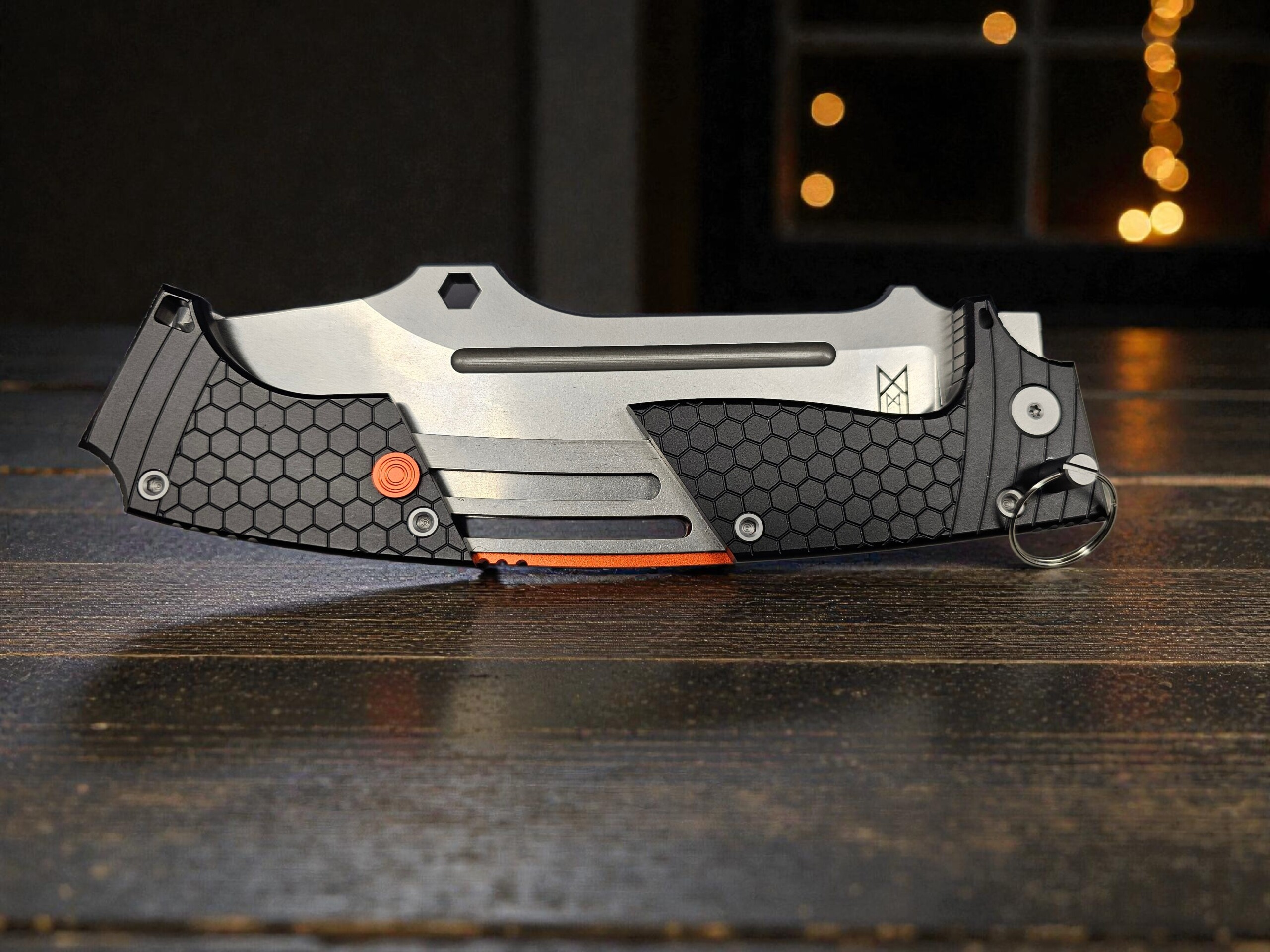 Dieses außergewöhnliche Klappmesser verbindet funktionale Vielseitigkeit mit einem markanten Community‑Design. Im ausgeklappten Zustand lässt sich der Griff nach vorne zusammenschieben, wodurch das Messer eine besonders kompakte, stabile und ergonomische Form erhält. Die Mechanik sorgt für ein sattes, präzises Handling und macht das Messer zu einem echten Hingucker für Sammler und Anwender.