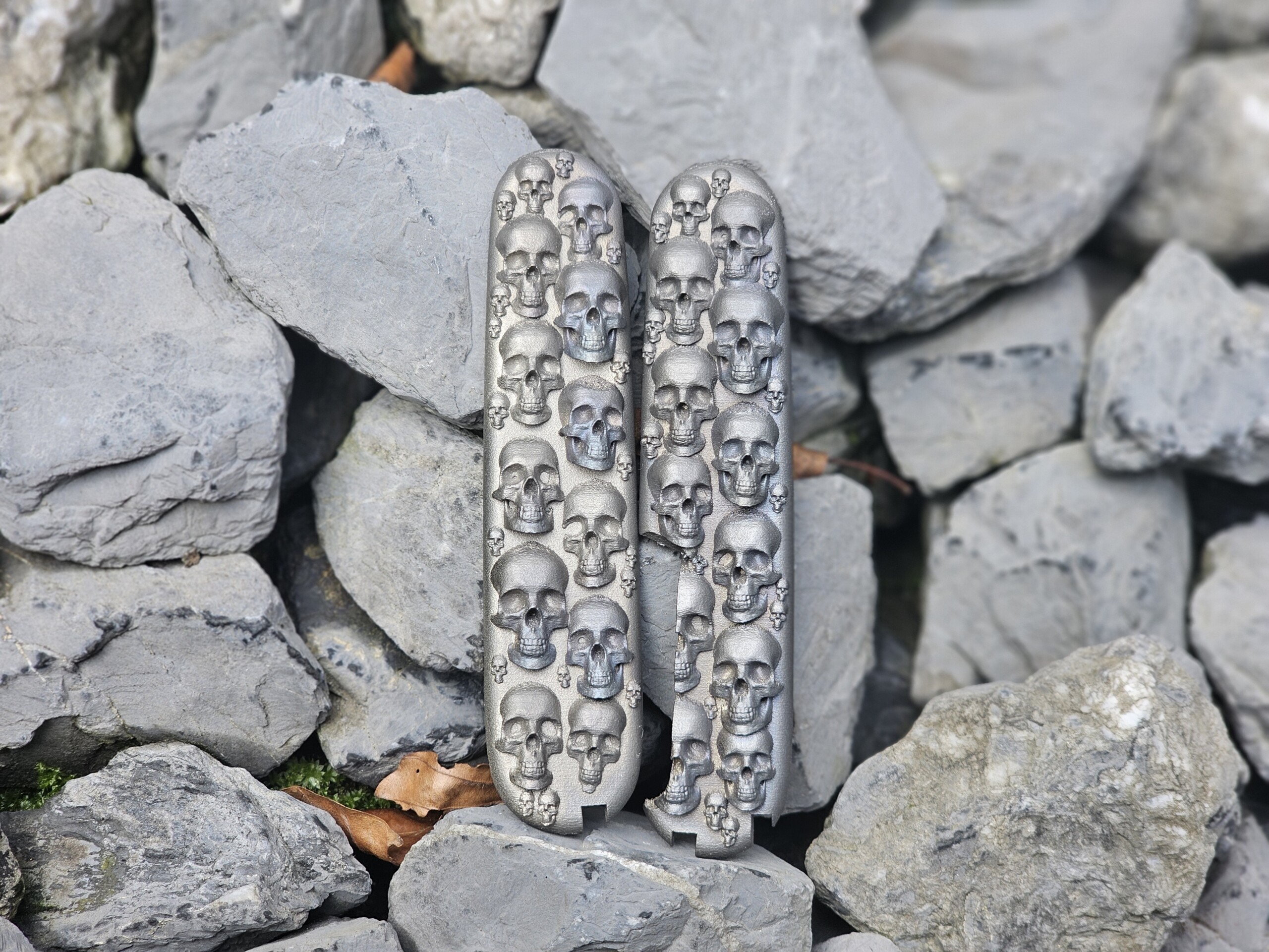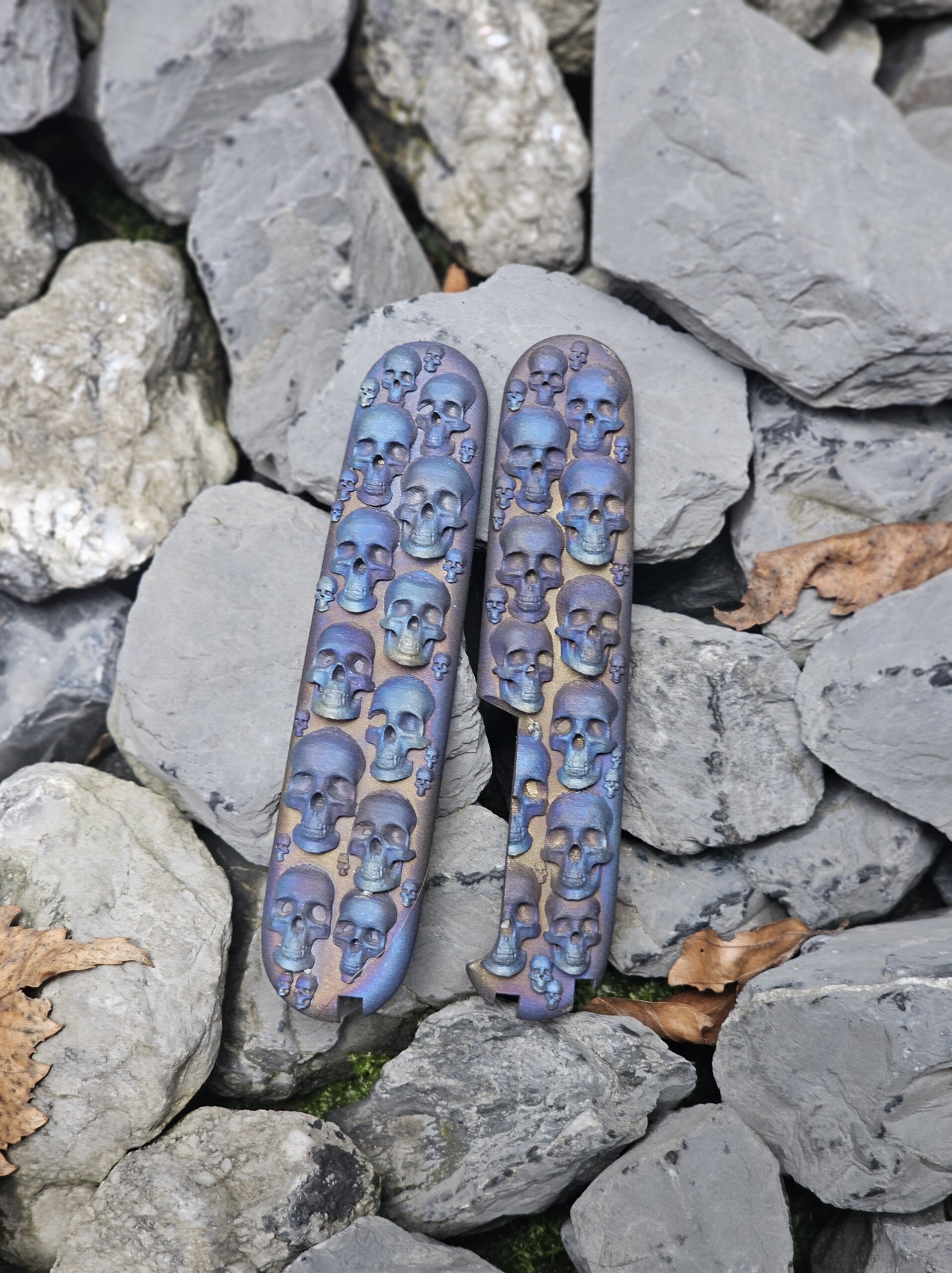Victorinox Griffschalen aus hochwertigem Titan mit detailreichen Totenköpfen. Die Griffe werden bei uns vor Ort mithilfe unseres Titandruckers gedruckt. Die Griffschalen werden nicht geschraubt ! Sie müssen geklebt werden !