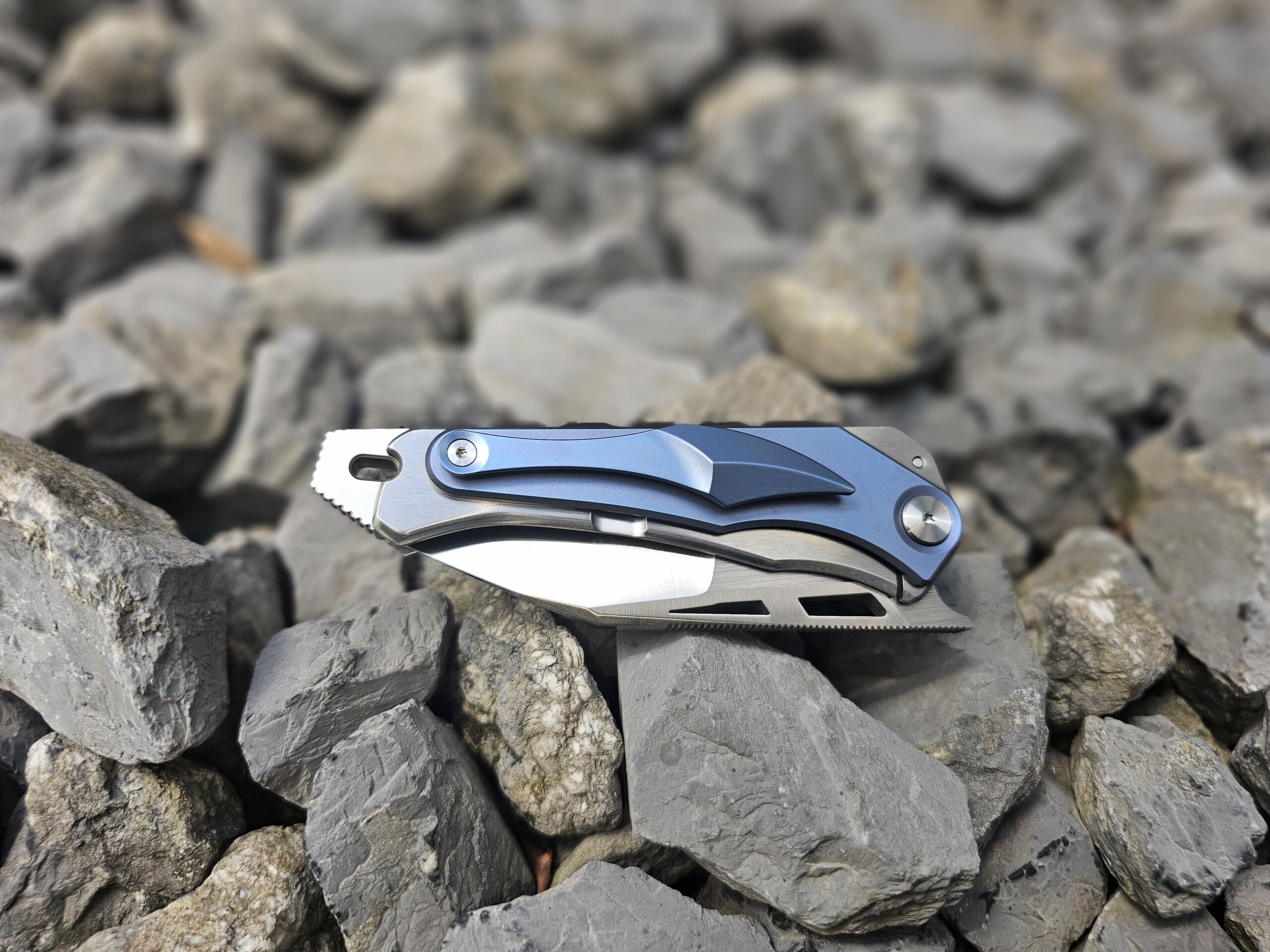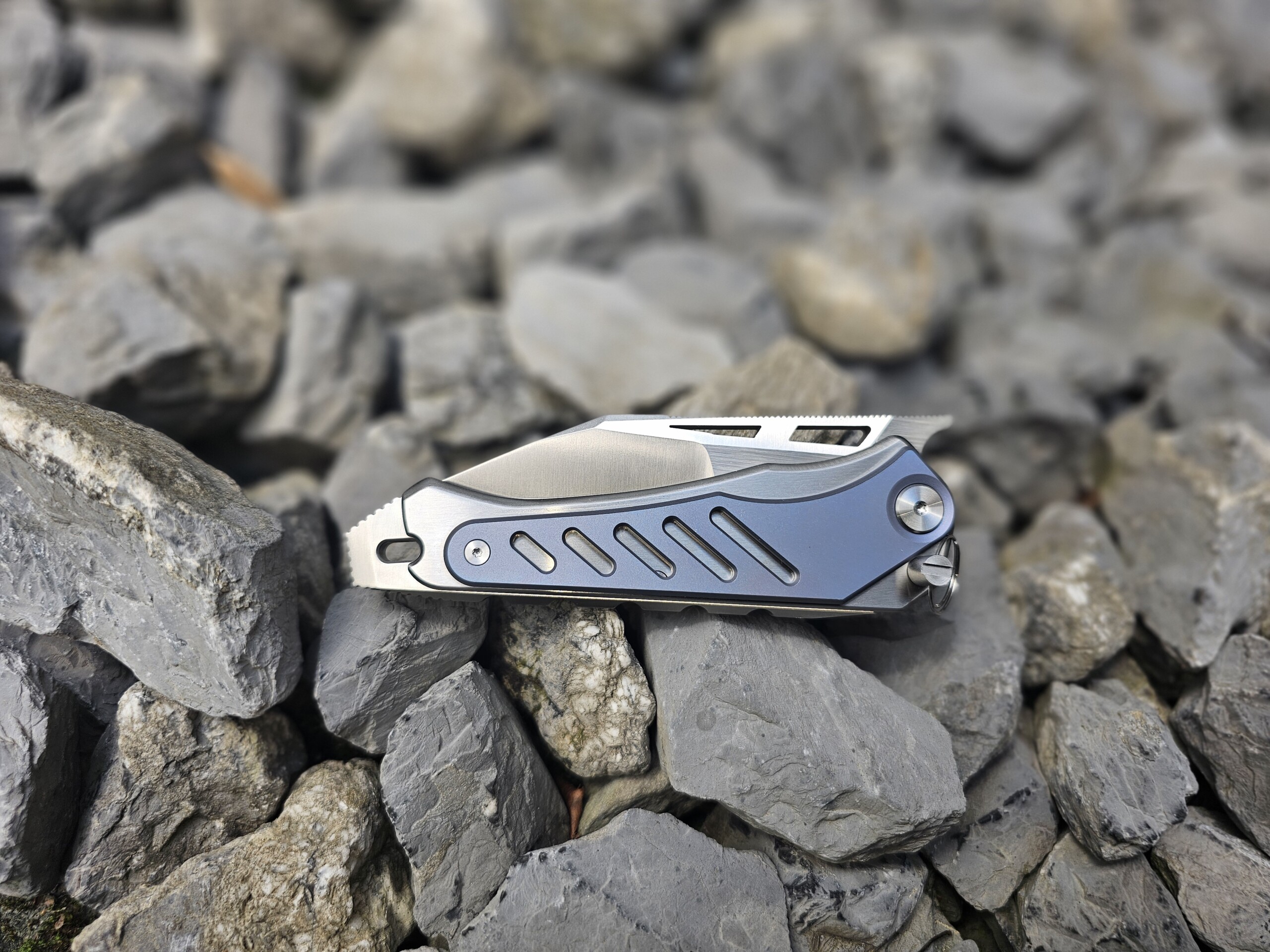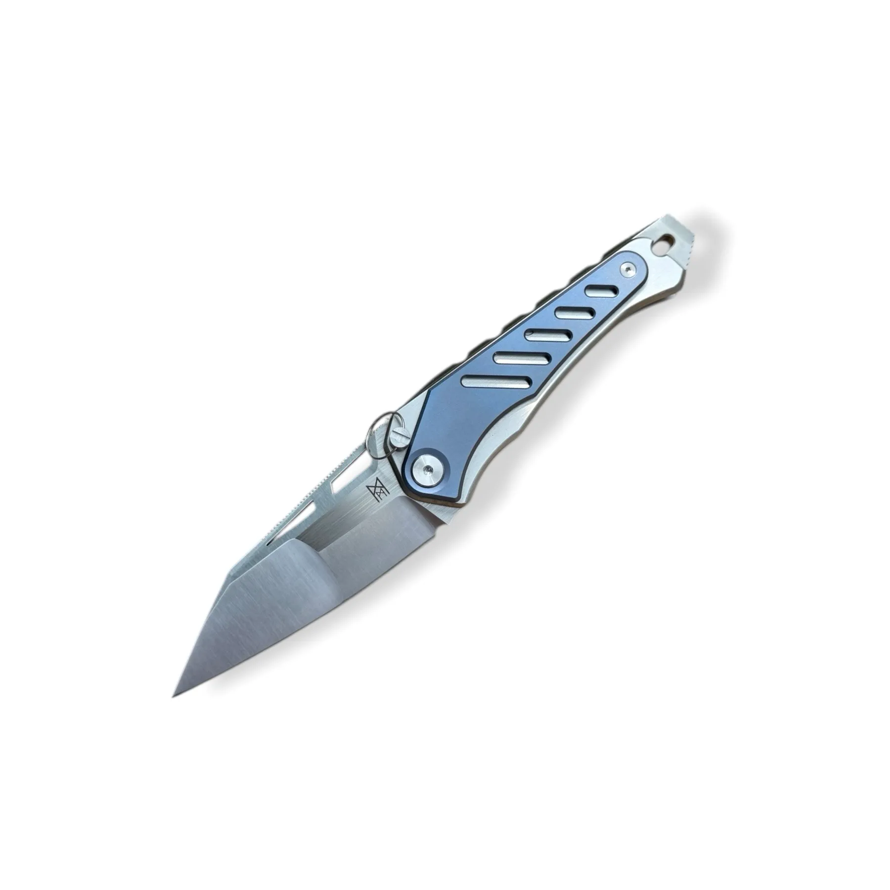 Das Zaria Folder ist nicht einfach nur ein Messer – es ist ein Statement. Mit seinem markanten, blauen Griff und dem futuristischen Design zieht es alle Blicke auf sich. Die massive Klinge aus hochwertigem 14C28N-Stahl misst 9 cm bei einer beeindruckenden Stärke von 5 mm und überzeugt durch eine aufwendige Doppel-Schliffgeometrie, die nicht nur optisch begeistert, sondern auch die Schneidleistung optimiert